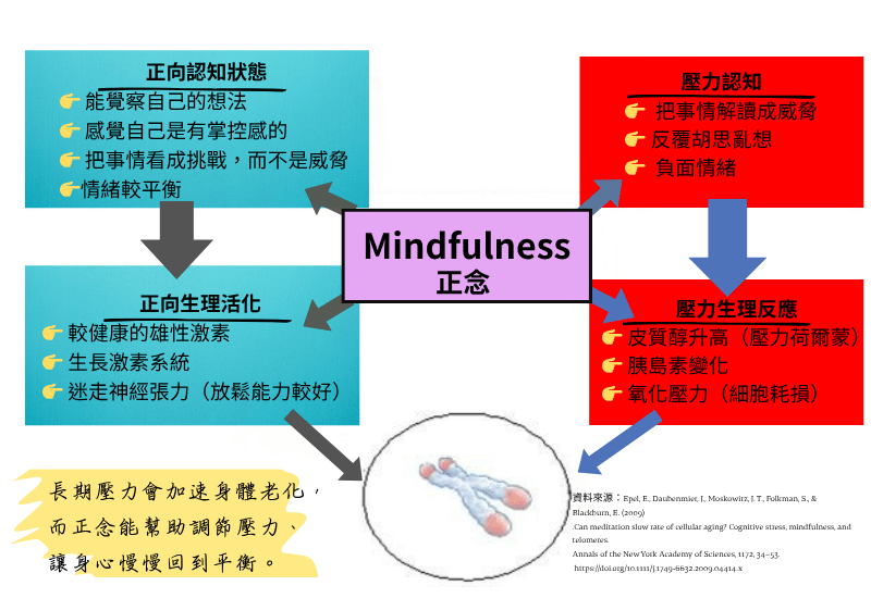 正念練習,透過調節壓力,影響與細胞老化相關的過程。